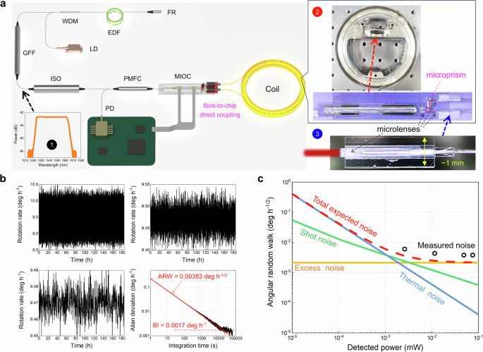 We present a groundbreaking navigation-grade interferometric air-core fibre optic gyroscope (IFOG) using a quadrupolar-wound coil of four-tube truncated double nested antiresonant nodeless fibre (tDNANF). This state-of-the-art tDNANF simultaneously achieves low loss, low bend loss, single-spatial-mode operation, and exceptional linear polarization purity over a broad wavelength range. Our 469 m tDNANF coil demonstrated a polarization extinction ratio (PER) of ~20 dB when illuminated by an amplified spontaneous emission (ASE) source spanning 1525-1565 nm. Under these conditions, the gyro archives an angular random walk (ARW) of 0.00383 deg h−1/2 and a bias instability (BI) drift of 0.0017 deg h−1, marking the first instance of navigation-grade performance in air-core FOGs. Additionally, we validated the low thermal sensitivity of air-core FOGs, with reductions of 9.24/10.68/6.82 compared to that of conventional polarization-maintaining solid-core FOGs of the same size across various temperature ranges. These results represent a significant step towards long-standing promise of high-precision inertial navigation applications with superior environmental adaptability.